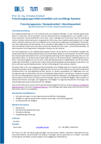 Die Arbeit findet in der Forschungsgruppe Elektromobilität und Lernfähige Systeme im Kontext eines laufenden Kooperationsprojekts mit der AUDI AG in Ingolstadt statt. Sie wird von Prof. Endisch vom Lehrstuhl für elektrische Antriebssysteme und Leistungselektronik (EAL) betreut. Es besteht grundsätzlich die Möglichkeit eine Forschungspraxis oder Semesterarbeit mit einer anschließenden Masterarbeit zu kombinieren. Studenten erwartet bei uns eine erstklassige Betreuung durch unsere wissenschaftlichen Mitarbeiter, die Möglichkeit zum akademischen Austausch mit Forschern aus diversen Fachrichtungen und eine sinnstiftende Tätigkeit. Dafür erwarten wir überdurchschnittliche Leistungen und Engagement, die Fähigkeit zur eigenverantwortlichen Forschungs- bzw. Entwicklungsarbeit sowie Lernbereitschaft und -fähigkeit.
