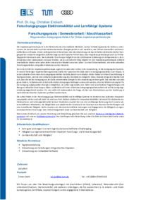 Die Arbeit findet in der Forschungsgruppe Elektromobilität und lernfähige Systeme im Kontext eines laufenden Kooperationsprojekts mit der Audi AG statt. Sie wird von Prof. Endisch (Institut für innovative Mobilität / Lehrstuhl für elektrische Antriebssysteme und Leistungselektronik) betreut. Studenten erwartet bei uns eine erstklassige Betreuung durch unsere wissenschaftlichen Mitarbeiter, die Möglichkeit zum akademischen Austausch mit Forschern aus diversen Fachrichtungen und eine sinnstiftende Tätigkeit. Dafür erwarten wir überdurchschnitliche Leistungen und Engagement, die Fähigkeit zur eigenverantwortlichen Forschungs- bzw. Entwicklungsarbeit sowie Lernbereitschaft und -fähigkeit.