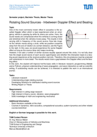 One of the most commonly known effect in acoustics is the socalled Doppler effect which is best experienced when an emergency vehicle is passing by while its sirens are active. Here, the sound waves are compressed when the vehicles is coming closer and stretched when the vehicles moves away. This results in time varying shift in frequency of the sound source. Now lets imagine the vehicle moves along a circle, while we position ourselves away from the axis of rotation at a certain distance, see the Figure to the right. In this case, we would experience the same Doppler effect as long as the source (blue dot) keeps revolving. However, if we add a number of similar sources equally spaced around this circle, it is not fully clear how the single sound waves of each source superimpose and whether this interaction leads to a beating sound experience at the receiver position (red dot). Therefore, this circumstance must be analyzed and understood in more detail. The results would close a gap between the Doppler effect and the beating effect. In this work, the student will improve her/his basic skills in literature research, programming (Matlab and/or Python), physical understanding of wave propagation, and wave interaction as well as scientific writing. If outstanding results can be achieved, it is intended to publish the work in an international journal.