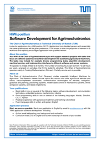 As a HiWi at the Chair of Agrimechatronics you will support research projects with tasks that focus on software systems and software development for automating agricultural machinery. The tasks may include for example diverse programming tasks, algorithm development, machine learning, and implementing interfaces to different software and sensor systems.