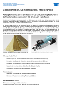 Im Rahmen dieser Arbeit soll der Stand der Technik im Bereich Co-Extrusion von Endlosfasern mit kleinen Schneckenextrudereinheiten im 3D-Druck erarbeitet und daraus notwendige und geeignete Komponenten für einen Co-Extrusionskopfs für den Einsatz in einem 3D-Drucker identifiziert oder entwickelt werden. Das Ziel ist ein schlüssiges Konzept für eine solche Extrudereinheit. Diese muss sehr leicht und kostengünstig sowie für den Einsatz von Naturfasern geeignet sein. Die genaue Aufgabenstellung und der Umfang der Arbeit kann auf Wunsch auf die individuellen Interessen des bearbeitenden Studenten abgestimmt werden.