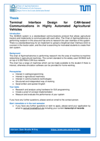 The ISOBUS system is a standardised communications protocol that allows agricultural tractors and implements to communicate with each other. The Chair of Agrimechatronics is performing research in this area and has aims to research the user interface of this system. There is a standardised way for an implement to upload a Graphical User Interface (GUI) to a screen in the tractor cabin, and the chair is searching for motivated students to create their own system.