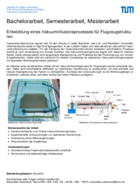 Im Rahmen einer studentischen Arbeit soll ein Vakuuminfusionsprozess für Flugzeugstrukturen entwickelt werden. Dabei sind verschiedene Methoden zur optimierten Harzführung zu untersuchen, um eine schnelle und robuste Imprägnierung der Fasern zu ermöglichen. Auf Basis der Untersuchungen ist ein Werkzeugdesign zu entwickeln, welches einen schnellen Aufbau bei hoher Präzision ermöglicht.