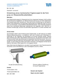Das Ziel dieser Arbeit ist die Entwicklung eines Fügekonzepts, um die Fertigung von mobilen Wasserstoffspeichersystemen zu ermöglichen. Nach einer Aufstellung der notwendigen Anforderungen an die Fügestelle, soll systematisch ein Konzept entwickelt werden, welches diese Anforderungen erfüllt. Wirtschaftliche Gesichtspunkte, wie geforderte Stückzahlen oder Produktionszeiten sollen ebenfalls bei der Konzeptauswahl berücksichtigt werden. Das so entstandene Konzept soll mittels einer FEM-Simulation näher untersucht und weiter ausgearbeitet werden. Je nach Umfang der Arbeit sowie deinen Interessen und Fähigkeiten können die detaillierten Ziele dieser Arbeit besprochen und angepasst werden.