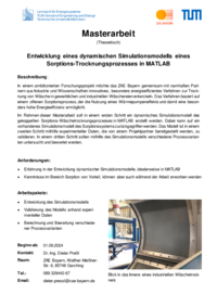 In einem ambitionierten Forschungsprojekt möchte das ZAE Bayern gemeinsam mit namhaften Partnern aus Industrie und Wissenschaft ein innovatives, besonders energieeffizientes Verfahren zur Trocknung von Wäsche in gewerblichen und industriellen Wäschereien entwickeln. Das Verfahren basiert auf einem offenen Sorptionsprozess, der die Nutzung eines Wärmepumpeneffekts und damit eine besonders hohe Energieeffizienz ermöglicht. Im Rahmen dieser Masterarbeit soll in einem ersten Schritt ein dynamisches Simulationsmodell des gekoppelten Sorptions-Wäschetrocknungsprozesses in MATLAB erstellt werden. Dabei kann auf ein vorhandenes Simulationsmodell des Sorptionssystems zurückgegriffen werden. Das Modell ist in einem zweiten Schritt mithilfe experimenteller Daten, die von einem Projektpartner bereitgestellt werden, zu validieren. In einem dritten Schritt sollen mithilfe des Simulationsmodells verschiedene Prozessvarianten untersucht und bewertet werden.