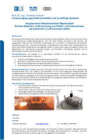 Rahmenbedingungen: Die Betreuung an der TUM übernimmt Prof. Endisch vom Lehrstuhl für Hochleistungs-Umrichtersysteme (HLU) und erfolgt in Zusammenarbeit mit der Forschungsgruppe Elektromobilität und Lernfähige Systeme im Kontext eines laufenden Kooperationsprojekts mit der Audi AG in Ingolstadt. Der genaue Inhalt der Arbeit kann abhängig von Ihren Interessen angepasst werden. Es besteht grundsätzlich die Möglichkeit, mehrere wissenschaftliche Arbeiten (z.B. Semesterarbeit, Forschungspraxis, Masterarbeit etc.) zu kombinieren.