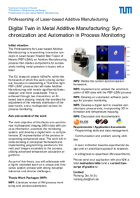 The main objective of this thesis is to synchronize multispectral imaging (MSI) data with process information, automate the monitoring system, and develop a digital twin—a comprehensive 3D representation of the process incorporating temperature data. The work will involve devising a conceptual framework and implementing programming solutions to link melt pool images accurately to the process, utilizing advanced temperature calculation algorithms.