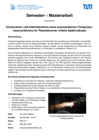 Fossile Energieträger dienen nach wie vor als Rohstoff für die Herstellung von Kraftstoffen, Kunststoffen und einer großen Anzahl von Basischemikalien. Um den Bedarf von fossilen Energieträgern in der Zukunft zu senken, müssen neue Verfahren erforscht werden, um die Umwandlung von Reststoffen wie beispielsweise Mischkunststofffraktionen zu Rohstoffen zu ermöglichen (Waste-to-X). Eine innovative Möglichkeit zur Herstellung nachhaltiger Chemikalien wie Methanol und anderer Kraftstoffe ist die Plasmaunterstütze Vergasung. Herzstück dieses Prozesses, der am Lehrstuhl für Energiesysteme aufgebaut wird, ist der Plasmabrenner. Die Kenntnis des Temperaturverlaufs in der Plasmaflamme ist dabei für den Prozess von zentraler Bedeutung. Aus diesem Grund soll im Rahmen dieser Arbeit ein System aufgebaut werden das in der Lage ist mit Hilfe optischer Emissionsspektroskopie (OES) den zweidimensionalen Temperaturverlauf der Plasmaflamme zu vermessen. Bevorzugt wird das Thema als Masterarbeit vergeben, allerdings ist es mit reduziertem Umfang auch als Semesterarbeit möglich. Bei Interesse bitte eine Bewerbung mit Lebenslauf und Leistungsnachweis an jonas.brandstetter@tum.de.