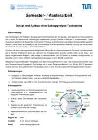 Pyrolyse als eine vielversprechende Möglichkeit Reststoffe für thermochemische Prozesse vorzubehandeln soll in kleinem Maßstab (1 kg/h) am Lehrstuhl für Energiesysteme erprobt werden. Dafür ist es nötig – auf Basis vergleichbarer Anlagen – die Anlage zu dimensionieren, ein 3D-Modell zu erstellen, Komponenten zu bestellen und je nach zeitlicher Verfügbarkeit aufzubauen und in Betrieb zu nehmen.