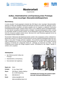 Die einzelnen Teilprozesse des Speicherprozesses wurden in den vergangenen Jahren umfassend experimentell untersucht. Im nächsten Entwicklungsschritt wird der Absorptionskältespeicherprozess erstmalig in Form eines Prototyps technisch umgesetzt. Die anvisierten Leistungsdaten liegen bei einer Lade-/Entladeleistung von 20 kW und einer Speicherkapazität von 100 kWh. Der Prototyp wird derzeit aufgebaut. Im Rahmen der vorliegenden Arbeit soll – abhängig vom Starttermin der Arbeit – bei der Fertigstellung des Aufbaus der Anlage mitgewirkt werden. Anschließend ist die Anlage in Betrieb zu nehmen und zu erproben.