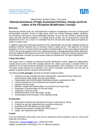 Project descriptionThis project aims to evaluate an existing Perception Modification system against the teleoperation concept Direct Control, where ROs remotely drive the AV, within a user study. It includes further development of the human-machine interface and the preparation and conduction of the user study. The study should primarily be conducted in the CARLA simulation environment, but may also be partially conducted with the research vehicle EDGAR.