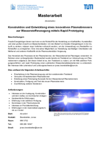 Das Herzstück des Prozesses ist der Plasmabrenner, der Wasserdampf als Plasmagas verwendet. Im Rahmen einer vorhergehenden Studienarbeit wurde bereits ein Teststand zur Untersuchung von Plasmabrennern aufgebaut. Ziel dieser Arbeit ist es, den Teststand zu nutzen, um mit Hilfe additiver Fertigungsverfahren und rapid Prototyping einen optimierten Wasserdampfplasmabrenner zu entwickeln. Bei Interesse bitte Lebenslauf an jonas.brandstetter@tum.de