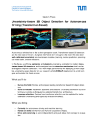 In this thesis, you’ll bring epistemic and aleatoric uncertainty estimation to modern transformer-based 3D detectors, and investigate how the attention mechanism itself can be leveraged to improve calibration. Your work helps pave the way for deploying a more capable, uncertainty-aware detector on our research vehicle EDGAR (deployment is a mid-term goal and outside this thesis scope).