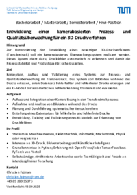 Konzeption, Aufbau und Validierung eines Systems zur Prozess- und Qualitätsüberwachung im 3D Druck. Das System soll Bilddaten während des Drucks erfassen, einen Datensatz fehlerhafter und fehlerfreier Drucke erzeugen und ein KI-Modell zur automatischen Fehlererkennung trainieren und evaluieren.