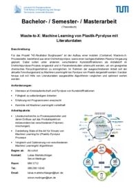 Für das Projekt "H2-Reallabor Burghausen" ist der Aufbau einer mobilen (Container) Waste-to-X-Prozesskette, bestehend aus einer Drehrohrpyrolyse, sowie einer nachgeschalteten Plasma-Vergasung geplant. Dabei sollen unter anderem verschiedene Kunststofffraktionen als Abfallstoff im Drehrohrpyrolyse-Prozess eingesetzt und in Parameterstudien untersucht werden, um ein geeignetes chemisches Recyclingverfahren zu ermöglichen. Im Rahmen der ausgeschriebenen Arbeit soll der aktuelle Forschungsstand zu Machine-Learning/AI bei Pyrolyse von Plastik dargestellt werden. Darüber hinaus soll mit Hilfe von Literaturdaten ausgewählte Algorithmen verglichen und optimiert werten werden.
