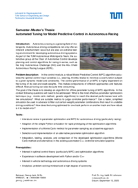 - MPC, Control, Autonomous Racing, Model Predictive Control, MPC Tuning, Optimal Control Algorithms, Autonomous Driving Thesis, Racing Simulation, Monte Carlo Optimization, Genetic Algorithms in Control, Offline Parameter Tuning, TUM Autonomous Motorsports, Indy Autonomous Challenge, Abu Dhabi Autonomous Racing League, Python Simulation for Control, Autonomous Vehicle Control, Control Systems Engineering, Thesis Opportunity TUM, Autonomous Driving Research, AI in Motorsports, Simulation-Based Optimization, Autonomes Rennfahren, Modellprädiktive Regelung, MPC-Optimierung, Regelungstechnik, Regelungsalgorithmen, Abschlussarbeit Fahrzeugtechnik, Rennsimulation, Monte-Carlo-Methode, Genetische Algorithmen Regelung, Parameteroptimierung offline, Autonomer Motorsport, Python-Simulation Regelung, Fahrzeugregelung autonom, Forschung autonomes Fahren, KI im Motorsport, Simulationsbasierte Optimierung
