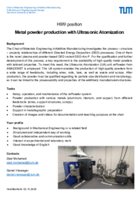 The Chair of Materials Engineering in Additive Manufacturing investigates the process – structure – property relationships of different Directed Energy Deposition (DED) processes. One of them is the novel plasma and powder-based DED variant DED-Arc-P. For the qualification and further development of this process, a key requirement is the availability of high-quality metal powders with tailored properties. To meet this need, the Ultrasonic Atomization (UA) unit rePowder from AMAZEMET is employed. This UA system enables the production of high-quality powders from a wide range of feedstocks, including wires, rods, bars, as well as waste and scraps. After production, the powder must be qualified regarding its particle size distribution and morphology, so it can be linked to the processability and properties of the additively manufactured structures