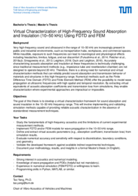 The goal of this thesis is to develop a virtual characterization framework for sound absorption and sound insulation in the 10-50 kHz frequency range. This will involve implementing and validating simulation methods capable of providing reliable acoustic characterization in the absence of standardized measurement techniques.