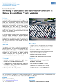 The objective of this thesis is to identify and characterize relevant disruptions and operational conditions for BET fleets. Building on this analysis, a scientifically grounded model will be developed in Python to enable more realistic simulations of BET operations in logistics. Existing modeling approaches from the literature should be reviewed, adapted, and integrated where suitable.