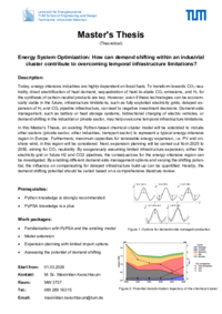 In this Master’s Thesis, an existing Python-based chemical cluster model will be extended to include other sectors (private sector, other industries, transport sector) to represent a typical energy-intensive valley in Europe. Furthermore, maximum capacities for renewable energy expansion, i.e. PV and onshore wind, in this region will be considered. Next, expansion planning will be carried out from 2025 to 2050, aiming for CO2 neutrality. By exogenously assuming limited infrastructure expansion, either the electricity grid or future H2 and CO2 pipelines, the consequences for the energy-intensive region can be investigated. By enabling different demand-side management options and varying the shifting potential, the influence on compensating for delayed infrastructure build-up can be quantified. Hereby, the demand shifting potential should be varied based on a comprehensive literature review.