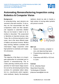 The objective of the thesis is to investigate approaches for automated part inspection in remanufacturing. This includes planning suitable poses and trajectories for robot-based image acquisition as well as developing deep learning solutions for automated defect detection (i.e., classification and/or segmentation methods). Ideally, the developed methods should be able to handle a high number of varying defect patterns and product variants.