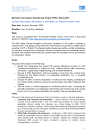 Literature and Channel Characterization: - Survey relevant channel disturbance sources for LEO satellite links in UHF (~437 MHz) and S-Band (~2.2 GHz). Identify applicable channel models from literature (e.g. Rician fading for LEO, ITU-R propagation models) (~2 weeks) - Define a set of representative degradation scenarios (e.g. nominal pass, low-elevation pass, interference event) with quantified parameters for each channel effect (~2 weeks)