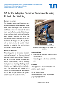This study aims to develop a decision-making framework for the execution of adaptive robotic arc welding. The work will be structured around problem definition, brainstorming, criteria development, decision-making, challenge identification and implementation methodology. The outcome will consist of a poster and comprehensive documentation of the insights and results generated through the students’ work.