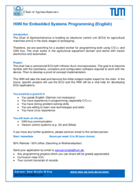 The Chair of Agrimechatronics has a new concept idea for an electronic control unit (ECU) for agricultural machines and is in the early stages of prototyping. Therefore, we are searching for a student worker for programming work using C/C++ and CAN bus. The chair works in the agricultural equipment domain and works with tractor electronics and automation.
