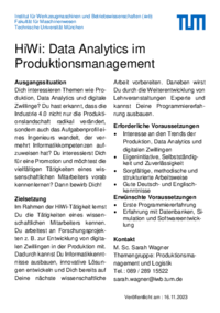 Dich interessieren Themen wie Produktion, Data Analytics und digitale Zwillinge? Du hast erkannt, dass die Industrie 4.0 nicht nur die Produktionslandschaft radikal verändert, sondern auch das Aufgabenprofil eines Ingenieurs wandelt, der vermehrt Informatikkompetenzen aufzuweisen hat? Du interessierst Dich für eine Promotion und möchtest die vielfältigen Tätigkeiten eines wissenschaftlichen Mitarbeiters vorab kennenlernen? Dann bewirb Dich!