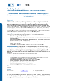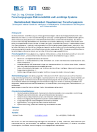 Rahmenbedingungen: Die Betreuung an der TUM übernimmt Prof. Endisch vom Lehrstuhl für Hochleistungs-Umrichtersysteme (HLU) und erfolgt in Zusammenarbeit mit der Forschungsgruppe Elektromobilität und Lernfähige Systeme im Kontext eines laufenden Kooperationsprojekts mit der Audi AG in Ingolstadt. Der genaue Inhalt der Arbeit kann abhängig von Ihren Interessen angepasst werden. Es besteht grundsätzlich die Möglichkeit, mehrere wissenschaftliche Arbeiten (z.B. Semesterarbeit, Forschungspraxis, Masterarbeit etc.) zu kombinieren.