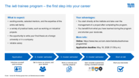 As a trainee, you will not only be particularly well integrated into the iwb community, but will also be actively prepared for a later career as a research associate at the institute. You will be assigned to a topic group and, through active involvement, will become familiar with the working environment of a research associate.