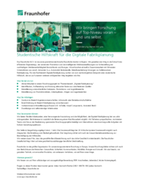 Das Fraunhofer IGCV ist das erste produktionstechnische Fraunhofer-Institut in Bayern. Wir gestalten den Weg in die Zukunft des effizienten Engineerings, der vernetzten Produktion und der intelligenten Multimateriallösungen zur Sicherstellung der nachhaltigen Wettbewerbsfähigkeit Deutschlands und Europas. Wir erforschen aktuell in Zusammenarbeit mit führenden Unternehmen aus versch. Industrien (u.a. Automobil, Batteriezelle, Metallverarbeitung) Lösungen zur kollaborativen Fabrikplanung. Für den Fachbereich Digitale Fabrikplanung suchen wir zum nächstmöglichen Zeitpunkt eine studentische Hilfskraft, die uns auf unserem weiteren erfolgreichen Weg begleiten möchte.