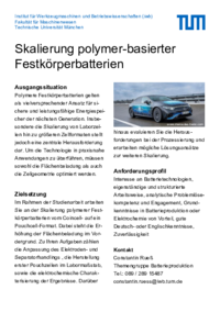 Im Rahmen der Studienarbeit arbeiten Sie an der Skalierung polymerer Festkörperbatterien vom Coincell- auf ein Pouchcell-Format. Dabei steht die Erhöhung der Flächenbeladung im Vordergrund. Zu Ihren Aufgaben zählen die Anpassung des Elektroden- und Separatorhandlings , die Herstellung erster Pouchzellen im Labormaßstab sowie die elektrochemische Charakterisierung der Ergebnisse. Darüber hinaus evaluieren Sie die Herausforderungen bei der Prozessierung und erarbeiten mögliche Lösungsansätze zur weiteren Skalierung.- Requirements