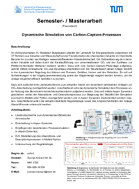 Plattformchemikalie Methanol realisiert werden. Dazu wird eine Carbon-Capture-Pilotanlage aufgebaut, welche mittels Aminwäsche CO2 aus Rauchgas abscheiden soll. Der Neuheitswert dieser Anlage besteht in der dynamischen Regelung der Aktoren wie Pumpen, Gebläse, Heizer und des Reboilers. Es soll auf Schwankungen in der Abgaszusammensetzung sowie der Abgasmenge reagiert werden können, um die Anlage möglichst effizient betreiben zu können.Dazu soll zunächst eine Literaturrecherche zum aktuellen Stand von dynamisch betriebenen Anlagen zur CO2-Abscheidung durchgeführt werden. Anschließend soll eine dynamische Simulation des Prozesses unter Nutzung des Benchmark-Amins Monoethanolamin aufgebaut werden. Dies soll mittels Aspen Dynamics geschehen, wobei der Absorptions- und Desorptionsprozess zur Steigerung der Stabilität der Simulation eventuell in Matlab oder Python durchgeführt werden und in Aspen Dynamics implementiert werden müssen. Anschließend sollen die aktuell entwickelte Regelstrategie sowie das Ansprechverhalten der Anlage überprüft sowie untersucht werden.