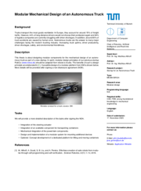 This thesis is about designing modular components for the mechanical design of an autonomous truck as part of a new startup. In spirit, modular design principles of our previous startup RobCo (https://www.robco.de/) should be adapted from robots to trucks. More details will be provided after signing a non-disclosure agreement (NDA).