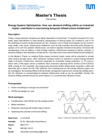 In this Master’s Thesis, an existing Python-based chemical cluster model will be extended to include other sectors (private sector, other industries, transport sector) to represent a typical energy-intensive region in Europe. Furthermore, maximum capacities for renewable energy expansion, i.e. PV and onshore wind, in this region will be considered. Next, expansion planning will be carried out from 2025 to 2050, aiming for CO2 neutrality. By exogenously assuming limited infrastructure expansion, either the electricity grid or future H2 and CO2 pipelines, the consequences for the energy-intensive region can be investigated. By enabling different demand-side management options and varying the shifting potential, the influence on compensating for delayed infrastructure build-up can be quantified. Hereby, the demand shifting potential should be varied based on a comprehensive literature review.