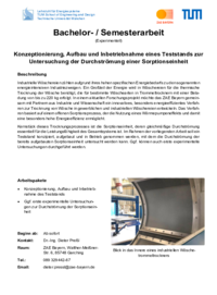 Kernstück dieses Trocknungsprozesses ist die Sorptionseinheit, deren gleichmäßige Durchströmung essentiell für die Leistungsfähigkeit des Gesamtsystems ist. Im Rahmen der vorliegenden Arbeit soll ein Teststand konzipiert, aufgebaut und in Betrieb genommen werden, mit dem die Durchströmung der bereits aufgebauten Sorptionseinheit untersucht werden kann. Ggf. können auch erste experimentelle Untersuchungen durchgeführt werden.