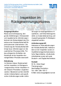 Im Rahmen dieser Studienarbeit soll die Inspektion im Rückgewinnungsprozess mit der Inspektion in der linearen Produktion verglichen werden. Basierend auf den identifizierten Unterschieden und spezifischen Anforderungen sollen Anforderungen an datengetriebene Inspektions- und Entscheidungsmodelle zur Zustandsbewertung und Auswahl geeigneter R-Strategien abgeleitet werden.