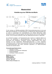 Am Lehrstuhl für Anlagen- und Prozesstechnik gibt es bereits ein validiertes Modell zum Wärme- und Stofftransport in Membranbefeuchtern. Ziel dieser Masterarbeit ist die Entwicklung eines detaillierten, physikalisch basierten PEMFC-Modells sowie dessen Kopplung mit dem bestehenden Membranbefeuchtermodell zu einem integrierten Gesamtsystemmodell. Auf Basis dieses gekoppelten Modells sollen Regelungsstrategien für den Membranbefeuchter unter realen, transienten Lastprofilen (z. B. NEDC-Fahrzyklus) entwickelt und bewertet werden.