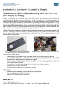 Additive manufacturing with continuous fiber reinforcement enables the production of high-performance composite parts with significantly improved stiffness and strength. In parallel, nonplanar 3D printing using multi-axis robotic systems allows for enhanced surface quality and the ability to fabricate complex geometries beyond conventional layer-by-layer approaches. Existing research has developed nonplanar slicing strategies and continuous fiber slicing methods independently, there is currently no unified slicing framework that combines both aspects. Most existing slicers are limited to either single-material nonplanar printing or planar carbon fiber deposition. However, combining nonplanar printing with continuous fiber reinforcement introduces additional challenges related to fiber manufacturability, path continuity, and robotic constraints.The goal of this thesis is therefore to develop a Python-based slicing framework that integrates nonplanar layer generation with continuous fiber path planning and robotic toolpath generation. The developed workflow should translate optimized fiber layouts into manufacturable, collision-free, and robot-compatible toolpaths for multi-material additive manufacturing.