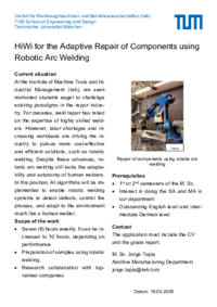 At the Institute of Machine Tools and Industrial Management (iwb), we seek motivated students eager to challenge existing paradigms in the repair industry. For decades, weld repair has relied on the expertise of highly skilled welders. However, labor shortages and increasing workloads are driving the industry to pursue more cost-effective and efficient solutions, such as robotic welding. Despite these advances, robotic arc welding still lacks the adaptability and autonomy of human welders. In this position, AI algorithms will be implemented to enable robotic welding systems to detect defects, control the process, and adapt to the environment much like a human welder.
