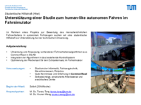 Im Rahmen eines Projekts zur Bewertung des menschenähnlichen Fahrverhaltens in autonomen Fahrzeugen suchen wir eine studentische Hilfskraft zur Unterstützung bei der technischen Umsetzung.