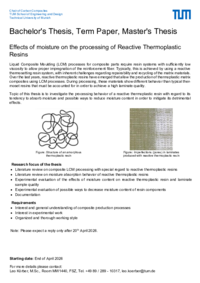 Topic of this thesis is to investigate the processing behavior of a reactive thermoplastic resin with regard to its tendency to absorb moisture and possible ways to reduce moisture content in order to mitigate its detrimental effects.