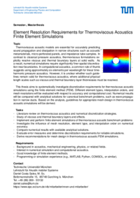 This thesis aims to systematically investigate discretization requirements for thermoviscous acoustic simulations using the finite element method (FEM). Different element types, interpolation orders, and mesh resolutions will be evaluated with respect to accuracy and computational cost. Numerical results will be compared with analytical solutions for canonical benchmark problems, such as wave propagation in narrow ducts. Based on the analysis, guidelines for appropriate mesh design in thermoviscous acoustic simulations will be derived.